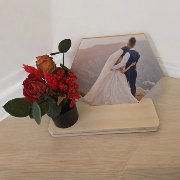 Verras iemand met een uniek en betekenisvol houten fotoplankje met foto en flesje, een elegant en persoonlijk fotocadeau dat zowel visueel als geurig indruk maakt. Dit houten plankje wordt gecombineerd met een klein flesje dat je kunt vullen met droogbloemen of huisparfum, wat zorgt voor een blijvende herinnering in huis.