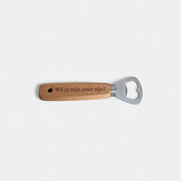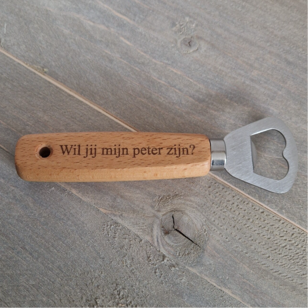 - Houten flesopener met gegraveerde tekst om peter te vragen