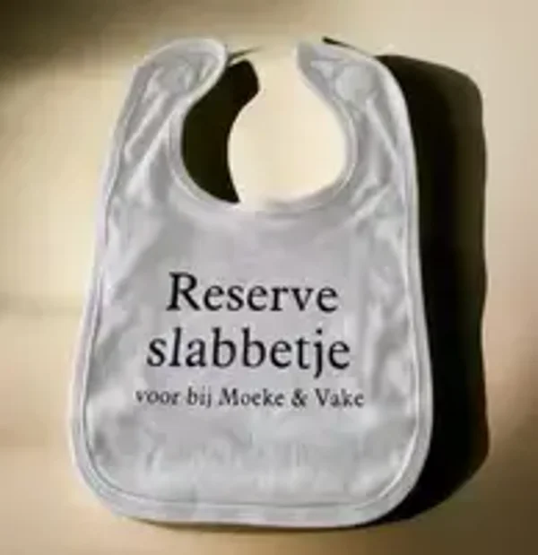 Het reserveslabbetje is een originele en speelse manier om je zwangerschap aan te kondigen. Dit schattige slabbetje is bedrukt met de tekst reserveslabbetje voor bij .... het slabbetje kan volledig gepersonaliseerd worden, ook voor tante, oma, opa, metie,...