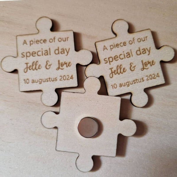 Een gepersonaliseerde magneet als huwelijksbedankje is een praktisch cadeau om je gasten te bedanken voor hun aanwezigheid op jullie speciale dag. Deze magneten in de vorm van een puzzelstukje kunnen gepersonaliseerd worden met jullie namen en trouwdatum.
