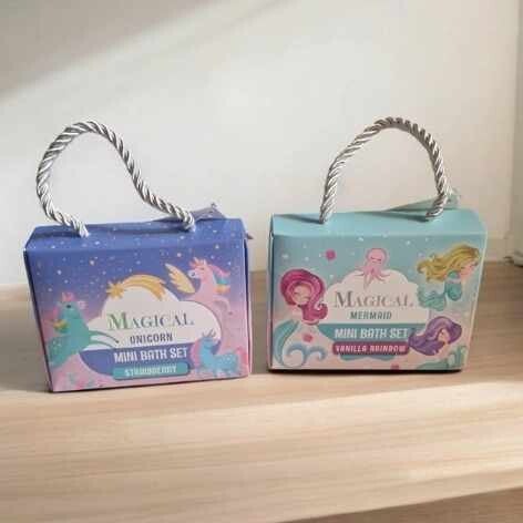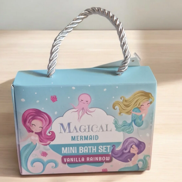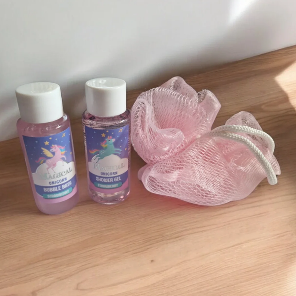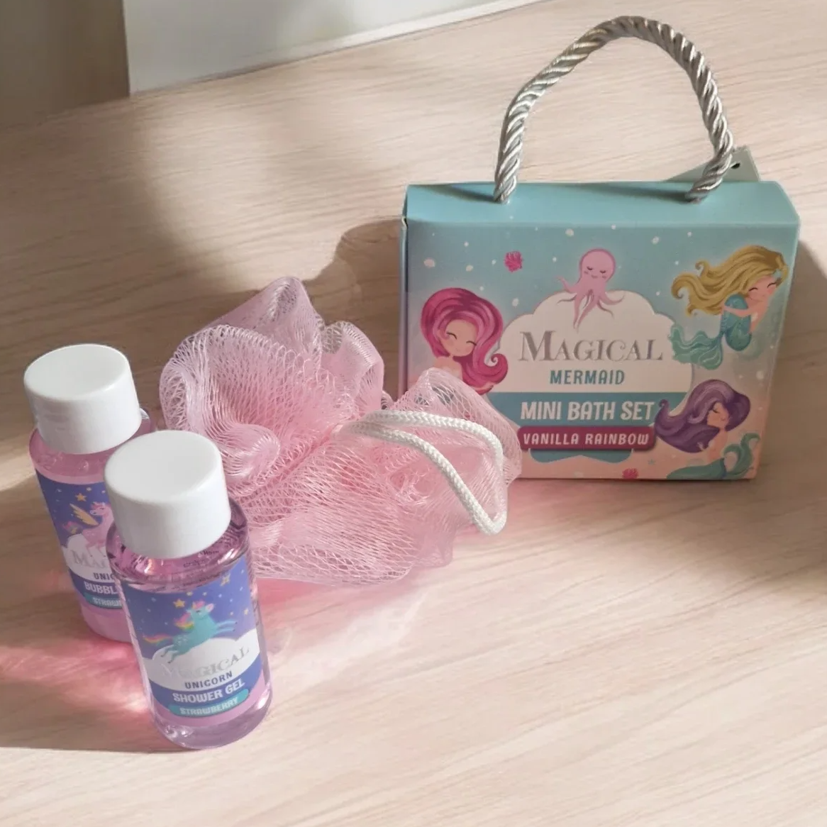 Mini geschenkset voor een vrolijk verwenmomentje. Dit setje bevat een douchel, mesh-spons en badschuim, alles wat je nodig hebt om van badtijd een feestje te maken.
