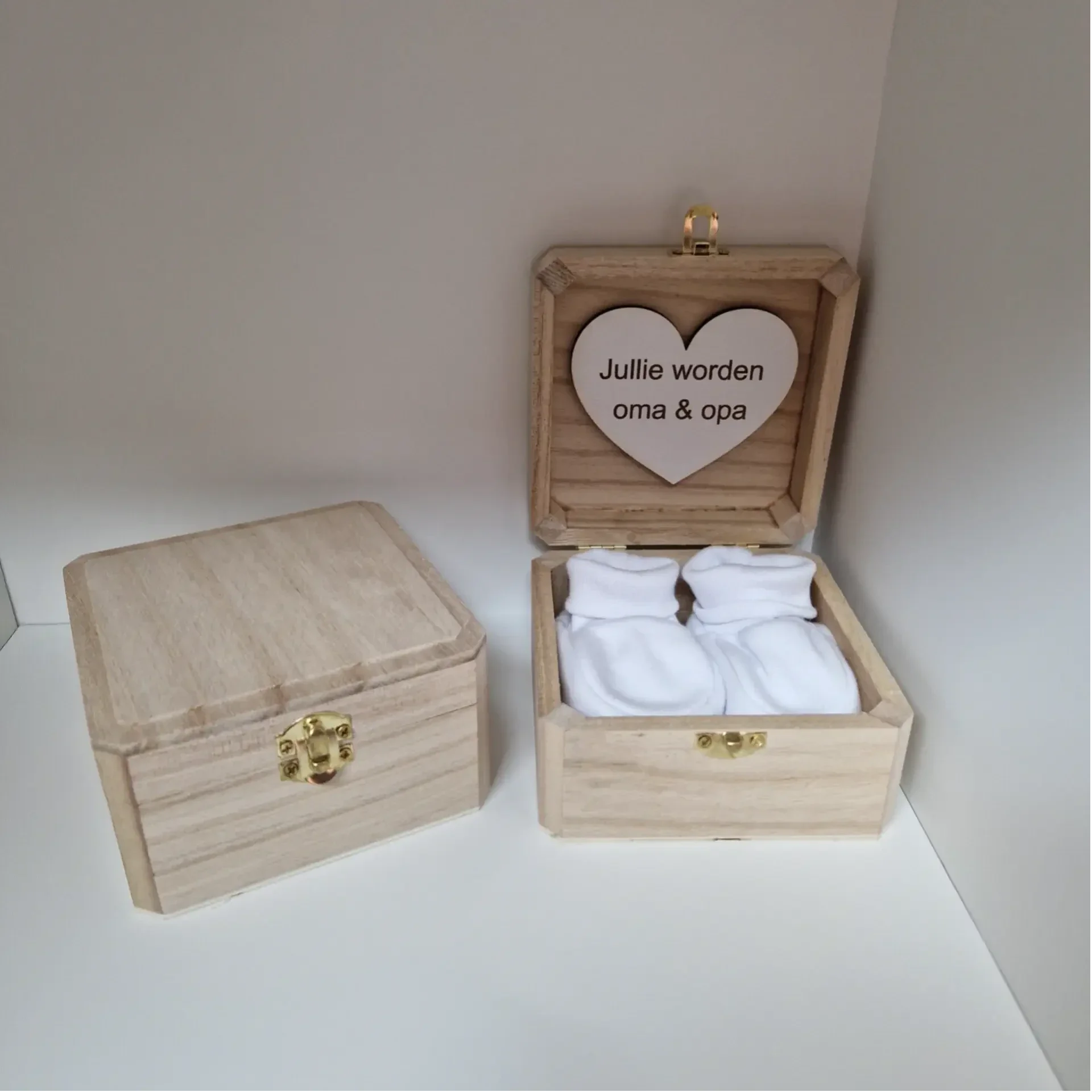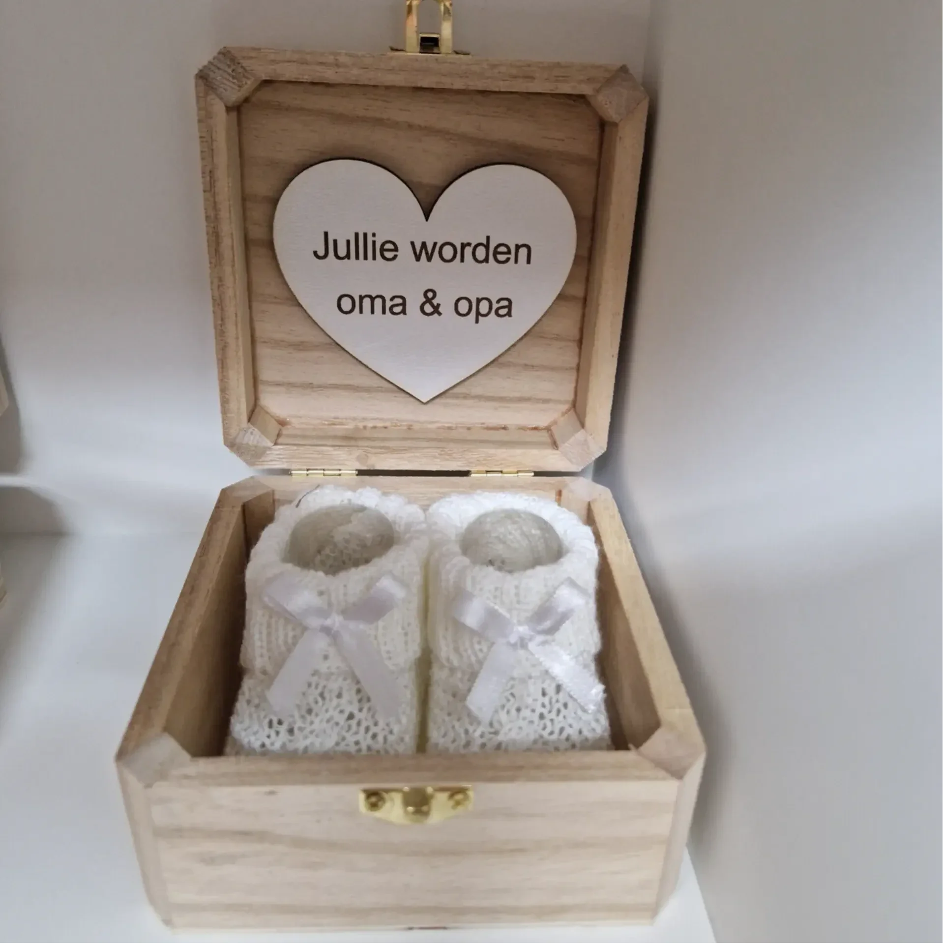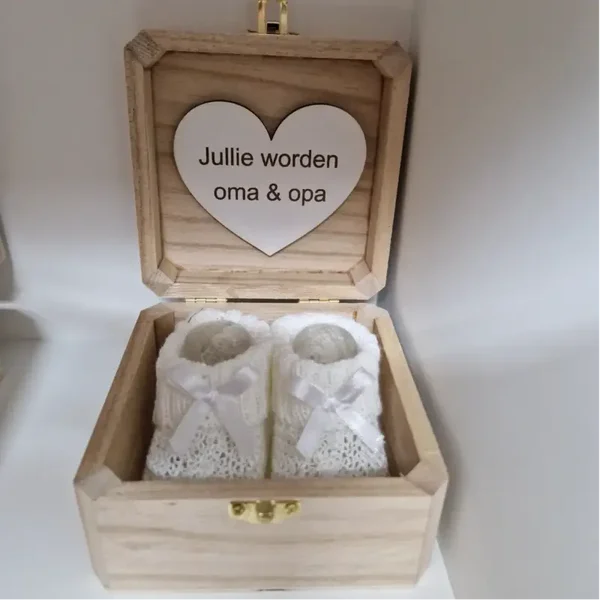 Verras je dierbaren met een originele zwangerschapsaankondiging, dit prachtige houten kistje is speciaal ontworpen om zwangerschap aan te kondigen.Bij het openen van het kistje vinden ze een paar babyslofjes en een wit hartje met een gepersonaliseerde tekst naar keuze.