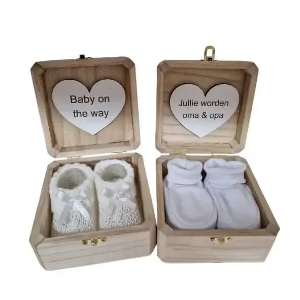 Wanneer het kistje geopend wordt, ontdekken ze een paar schattige babyslofjes en een houten hartje met een persoonlijke boodschap naar keuze. Dit zorgt voor een emotionele verrassing die gegarandeerd een glimlach én traantje oplevert.