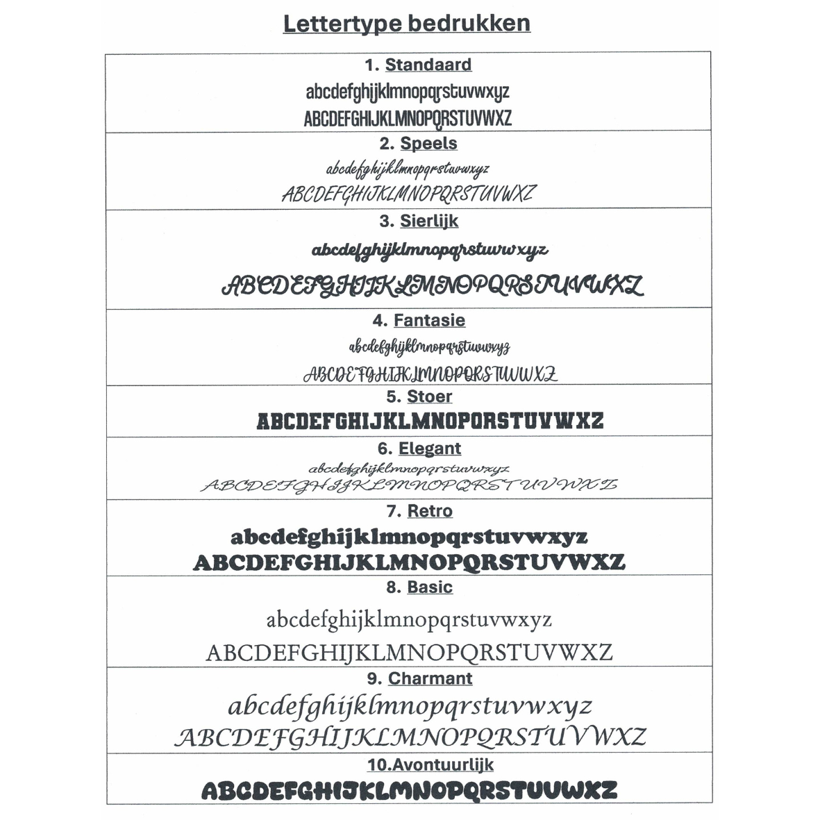 Indien je voor een eigen tekst of naam kiest kan je hier het lettertype noteren.