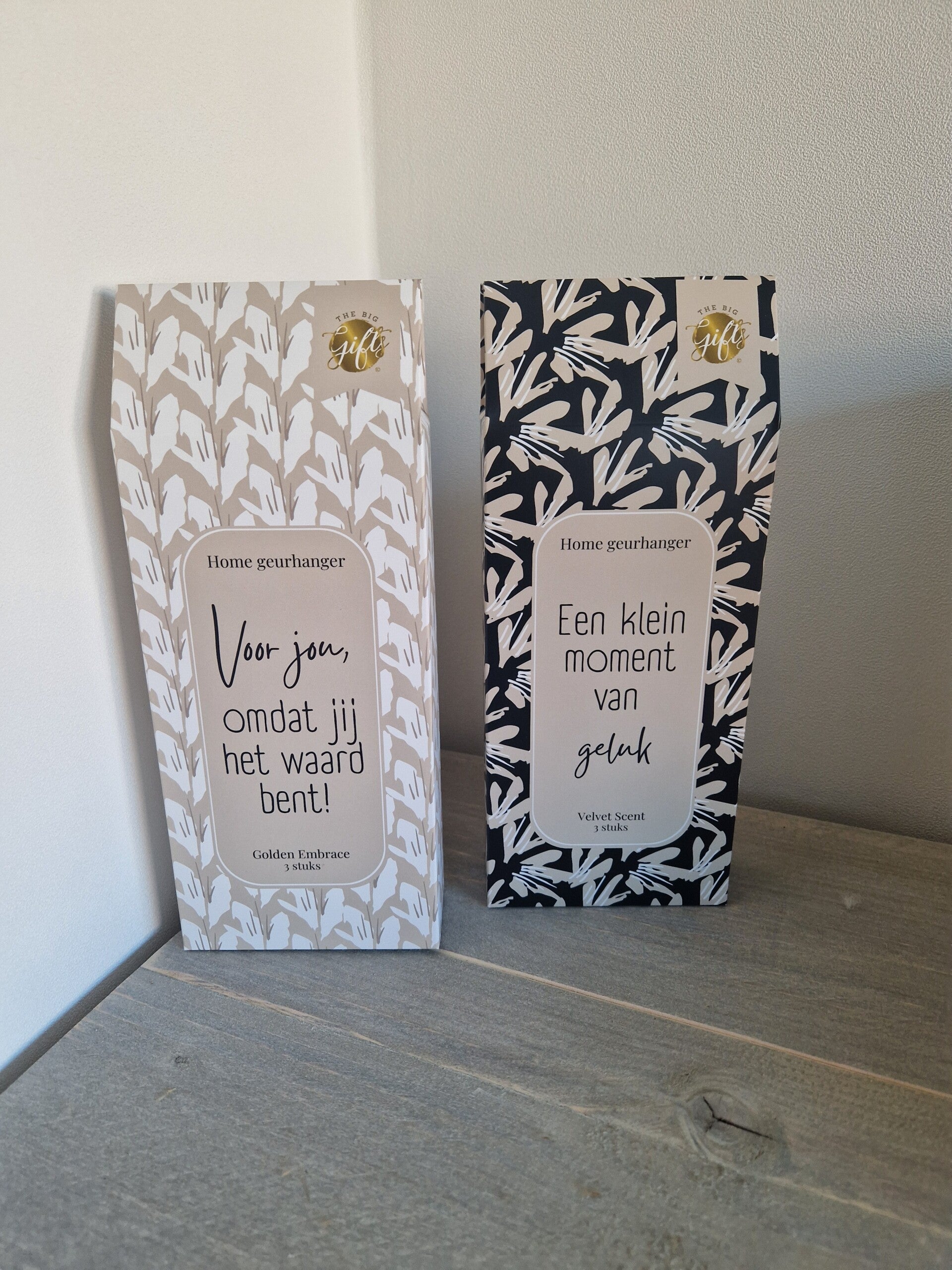 Breng een subtiel vleugje sfeer in elk hoekje van het huis met deze elegante Home Geurhanger-set. Deze drie stijlvolle geurhangers – twee met een patroon en één met tekst – zijn verpakt in een mooie, kant-en-klare verpakking, zodat je meteen kan geven of genieten. Kies uit twee unieke geuren: Golden Embrace (“Voor jou”) of Velvet Scent (“Geluk”), die elk kleine ruimtes zoals jouw kast, toilet of lades opfleuren.