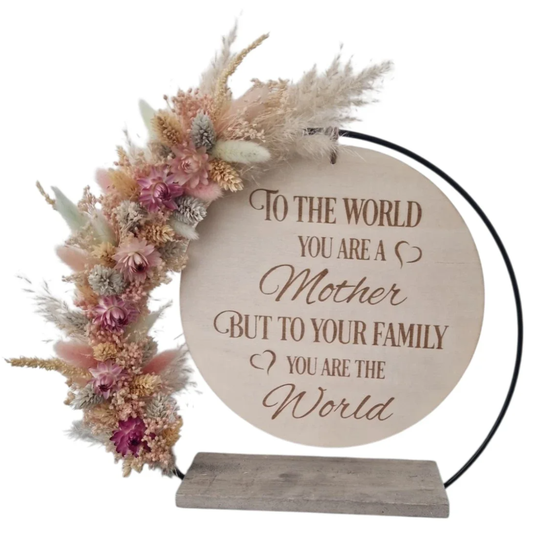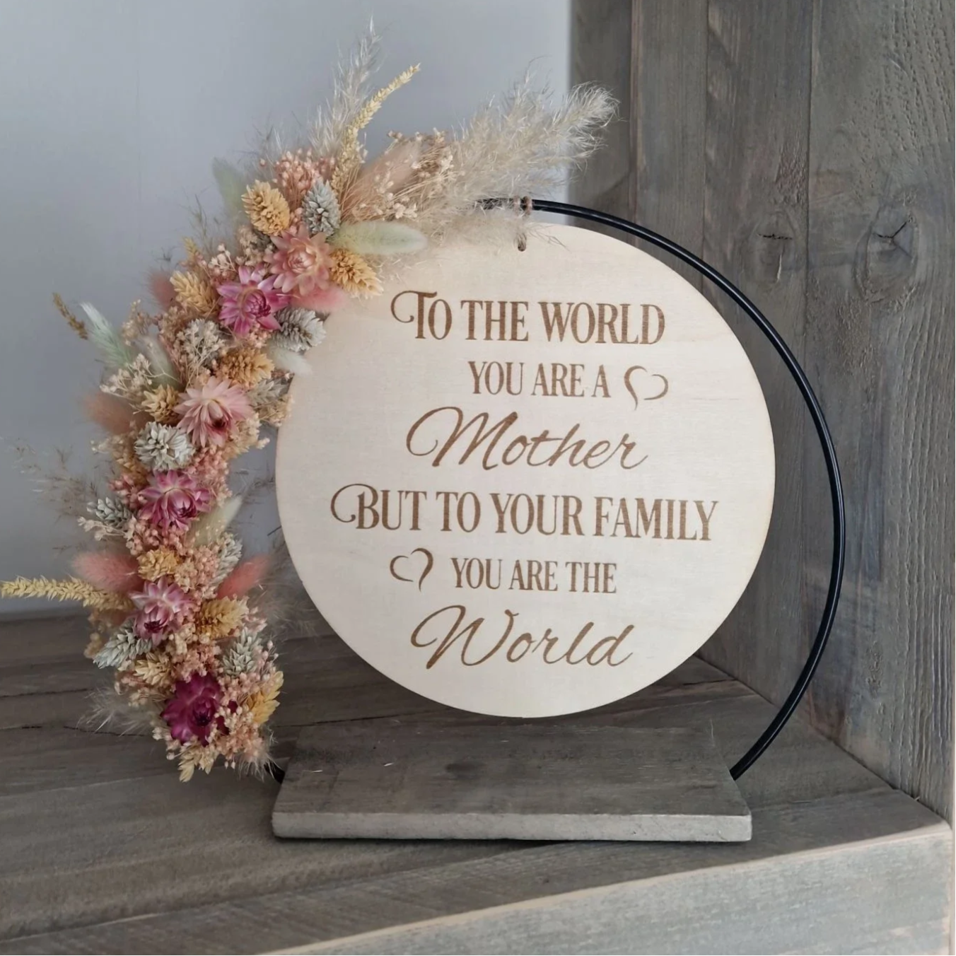 Een prachtig en betekenisvol cadeau voor mama. Deze decoratieve ring is voorzien met een houten plaatje met de tekst " To the world you are a mother, but to your family you are the world". Afgewerkt met een stijlvolle mix van zachte en natuurlijke droogbloemen in pasteltinten.