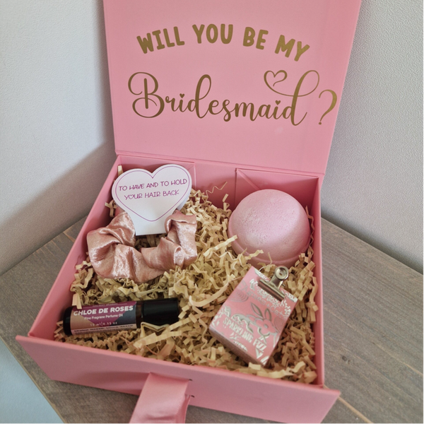 Design: luxe roze box met gouden tekst “Will you be my Bridesmaid?”