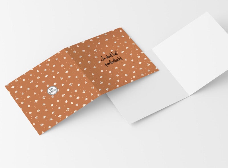 Een warm kaartje om iemand een hart onder de riem te steken of gewoon even te laten weten dat hij/zij het fantastisch doet. Met de tekst “Je doet het fantastisch!” en het vrolijke bloemenpatroon in zachte aardetinten is dit kaartje perfect om iemand een boost te geven of te bedanken voor hun inzet.