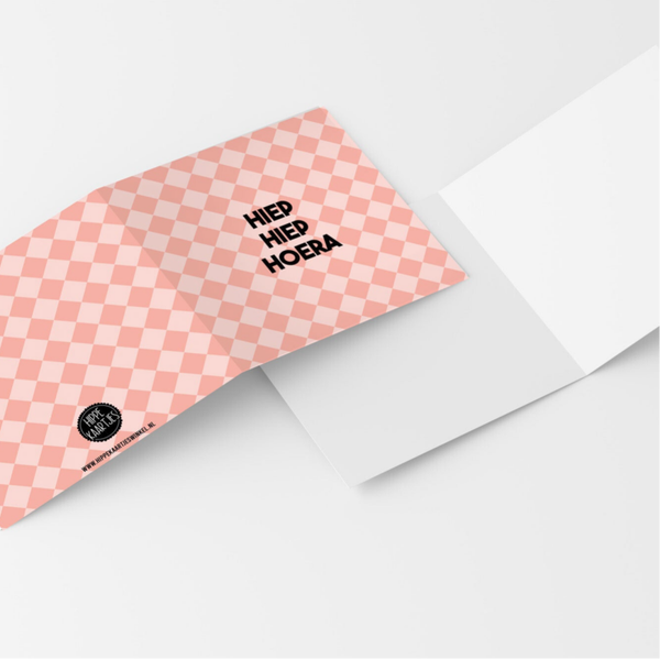 Vierkante kaart met de tekst “Hiep Hiep Hoera”