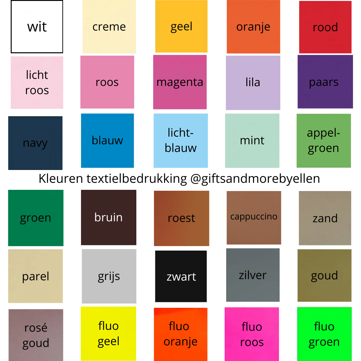 Noteer hier in welke kleur je de bedrukking/borduring wenst