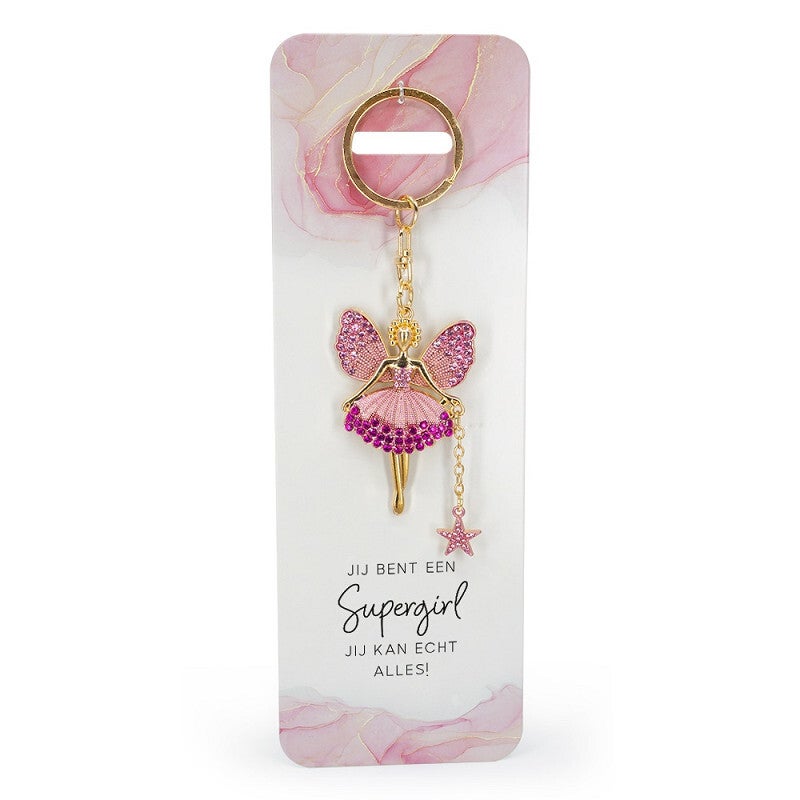 Deze elegante sleutelhanger met engelvorm is een schitterend cadeautje voor jong en oud. De hanger heeft een goudkleurige afwerking, fonkelende steentjes en een bijpassend gekleurd rokje. Aan het kettinkje hangt een klein sterrenbedeltje dat de sleutelhanger nét dat beetje extra charme geeft.