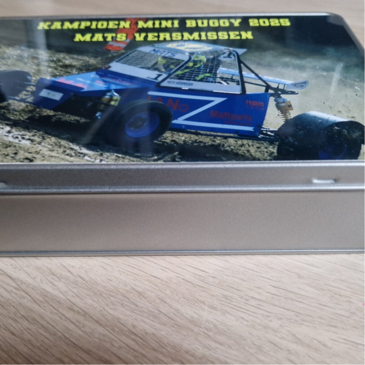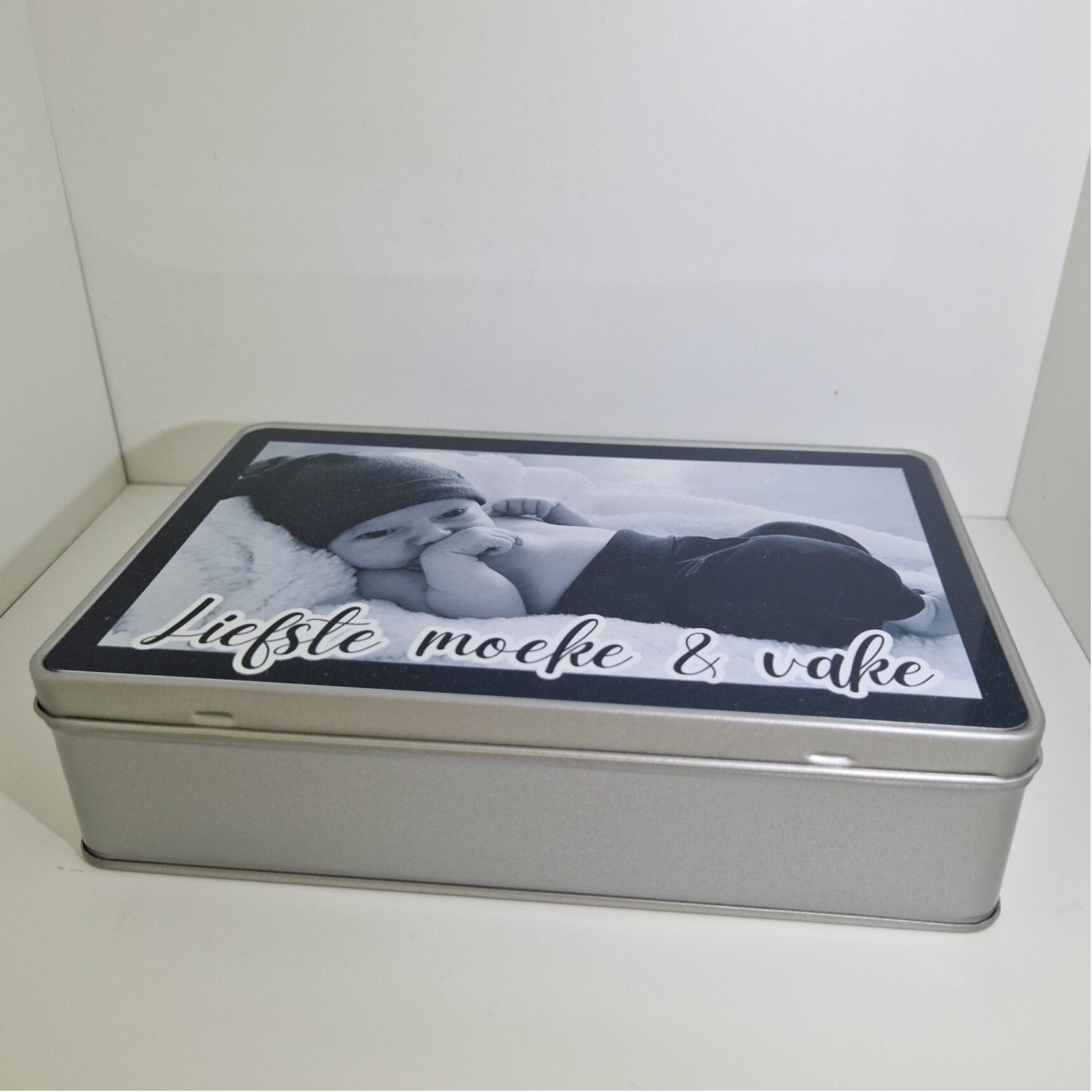 Een metalen koekjesblik met naam en/of foto, ideaal om koekjes, snoep of kleine herinneringen in te bewaren. De gepersonaliseerde bedrukking maakt dit blik uniek en persoonlijk.