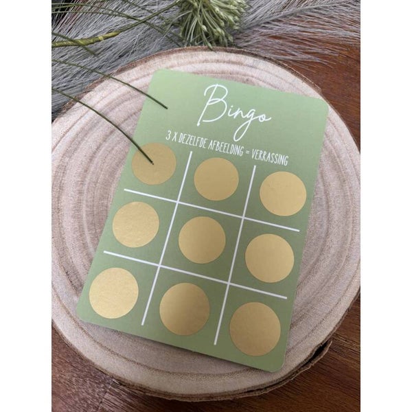 De kaart bevat 9 te krassen vakjes en zorgt voor een verrassend moment wanneer de bingo compleet is.