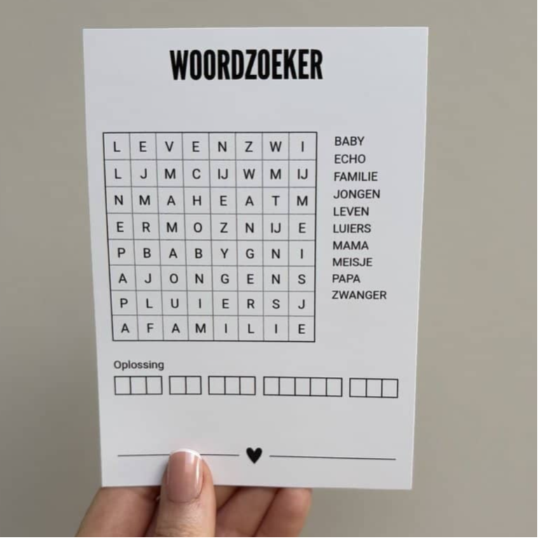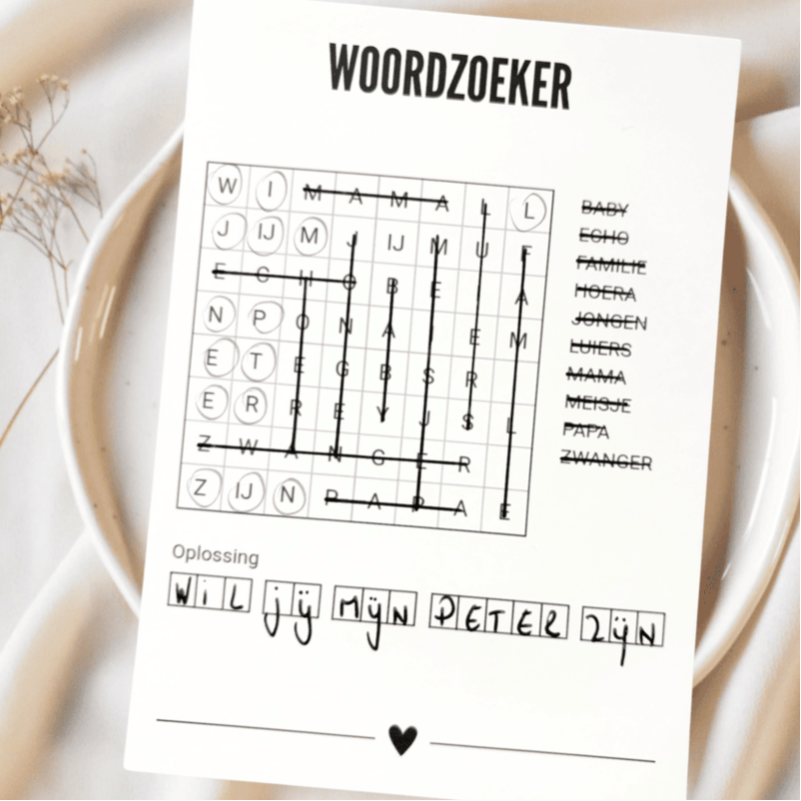 Vraag de meter of peter van jullie kindje op een originele en speelse manier met deze woordzoeker kaart.