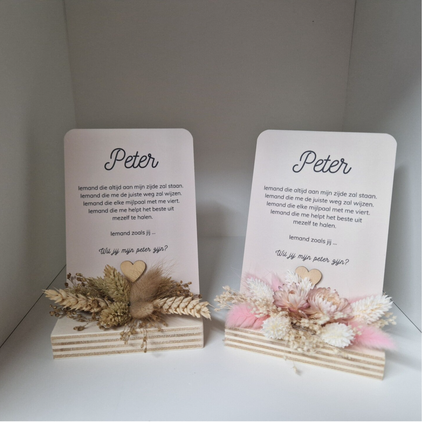 De kaart is verkrijgbaar als los kaartje of in combinatie met een houten kaarthouder met droogbloemen. Zo kan je kiezen voor een eenvoudige verrassing of een decoratief geheel dat een blijvende plaats krijgt in huis.
