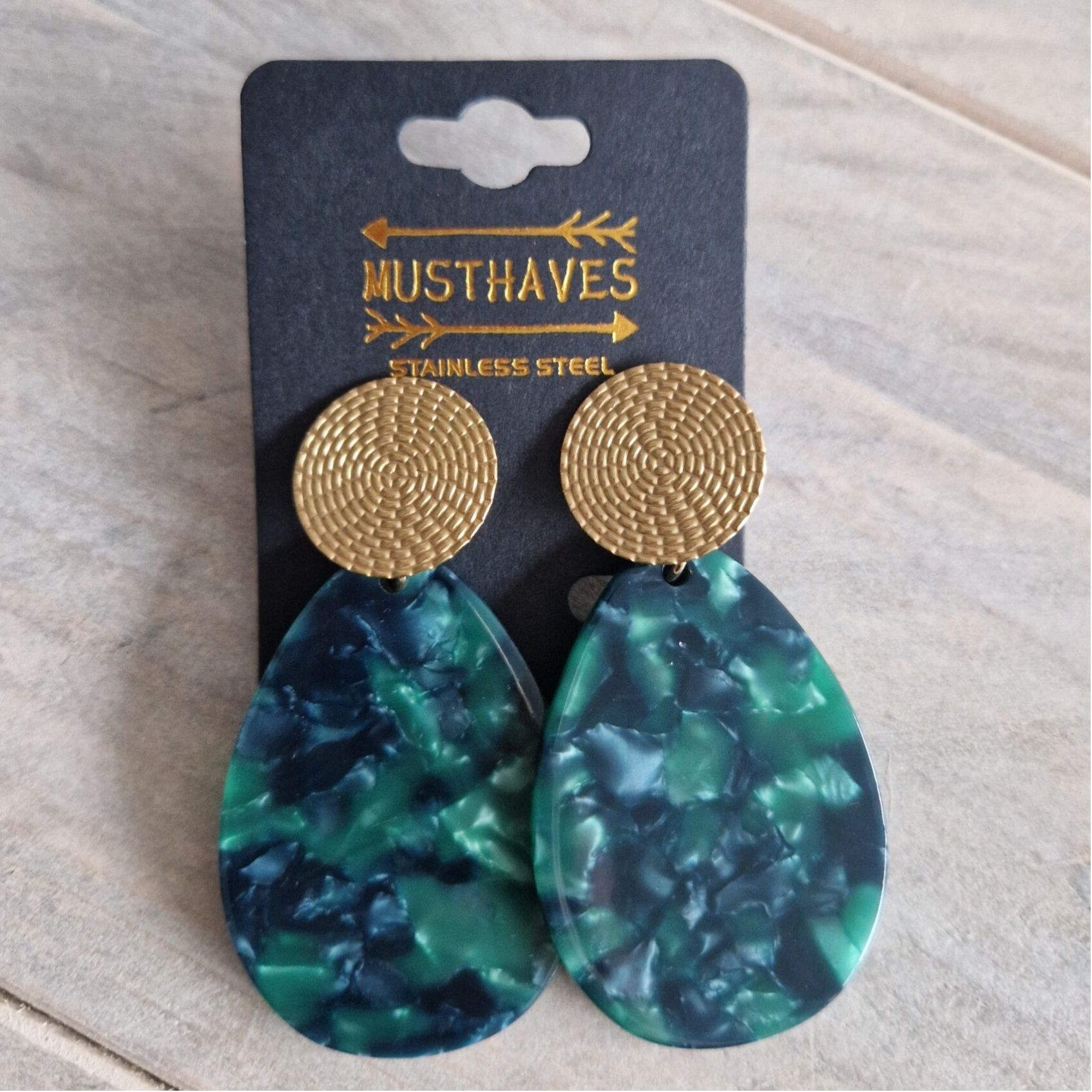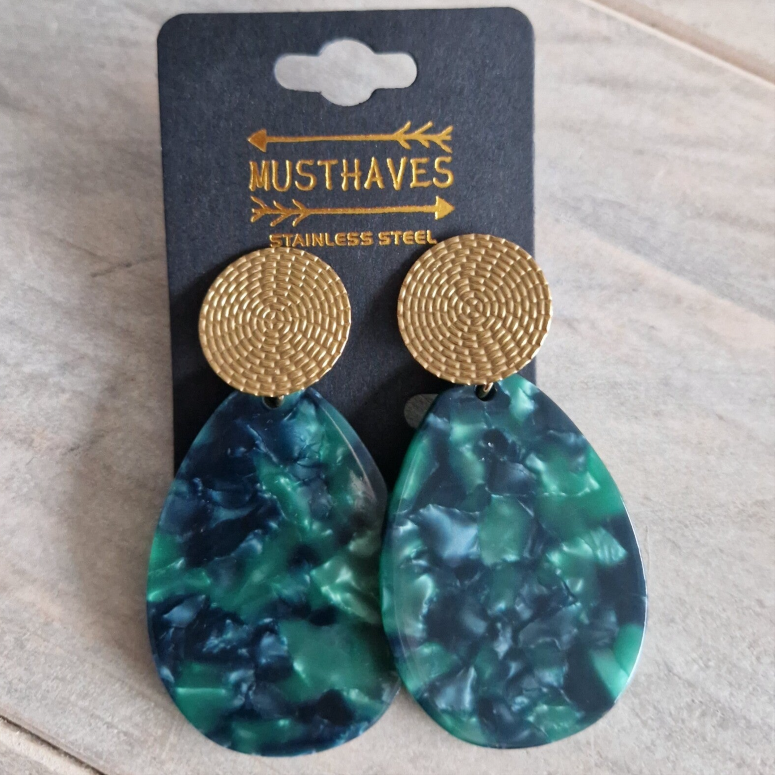 Deze stijlvolle druppelvormige oorbellen combineren een goudkleurige bovenkant met een opvallende resin hanger. De unieke marmer- en patroonstructuren geven elke kleur een eigen karakter, waardoor ze perfect passen bij zowel een casual als een feestelijke outfit.