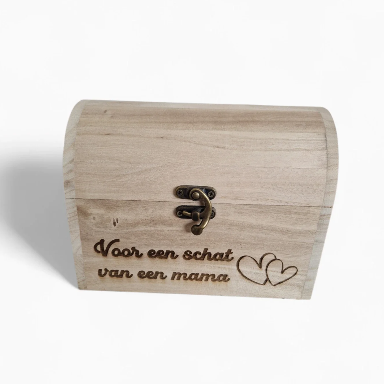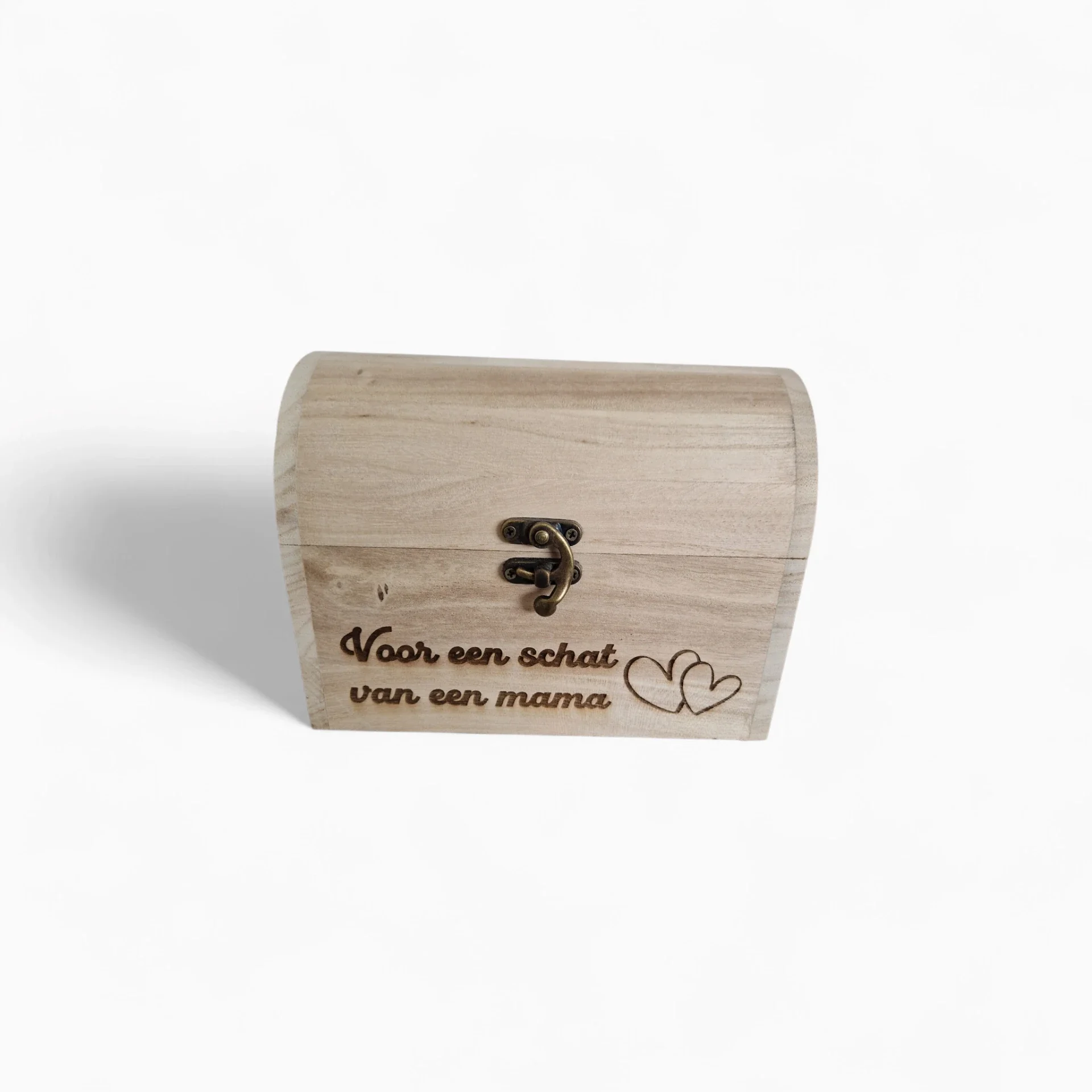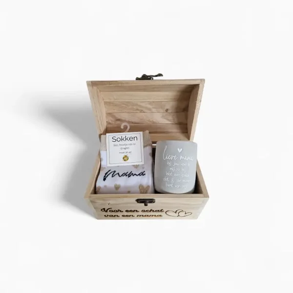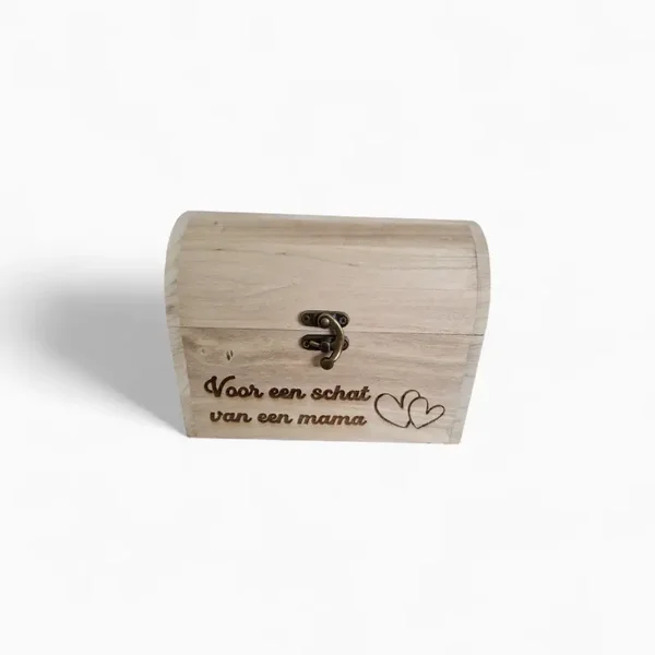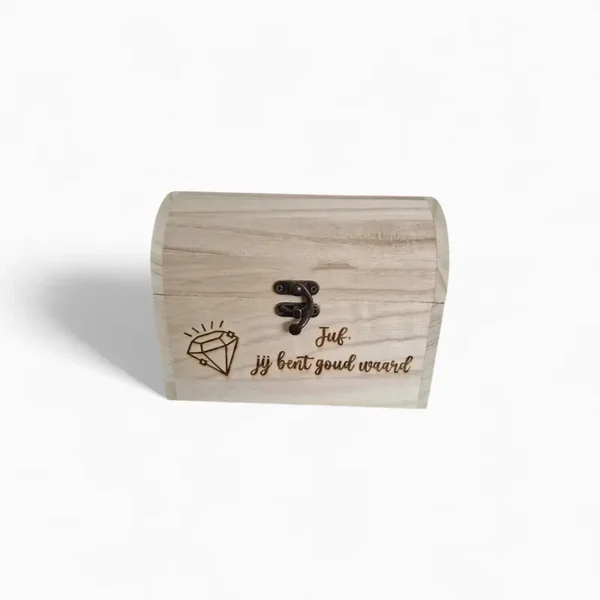Een houten schatkist met persoonlijke gravure die je zelf kan vullen met kleine cadeautjes voor een uniek en persoonlijk geschenk.